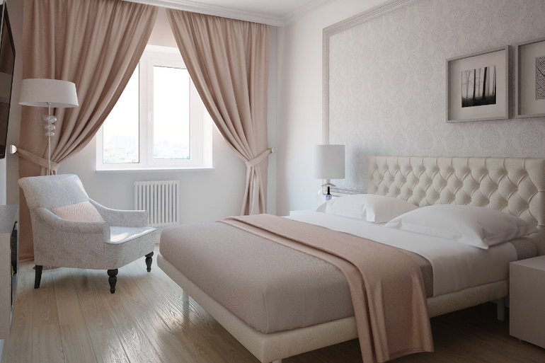 Интерьерное решение спальниХотелось светлой и теплой спальни. Полноценной кровати и много места под вещички. Изначально за креслом было большое прямоугольное зеркало в багетной раме, дорогой такой! Не было полки под тв. И добавили комод под окно. Угадали с расстановкой и цветом с первого раза, я влюбилась и уже не дождусь всего этого в живую!)))