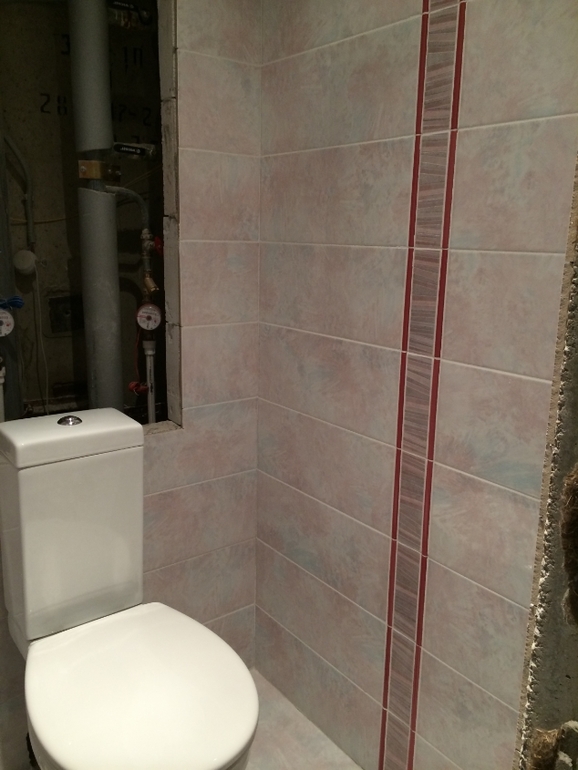 А что это за плитка в горошек? Крутая!!! А туалет как зашивать будете? Полки не делали около труб?
