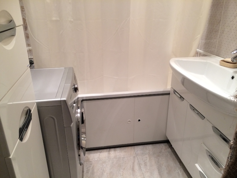 Зря вы так на плитку, очень хорошо смотрится. Горошек ванну сделал очень нежной. У вас под ванной что-то будет храниться?