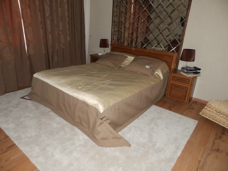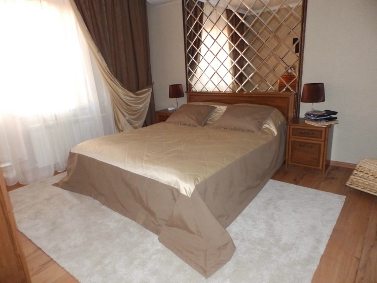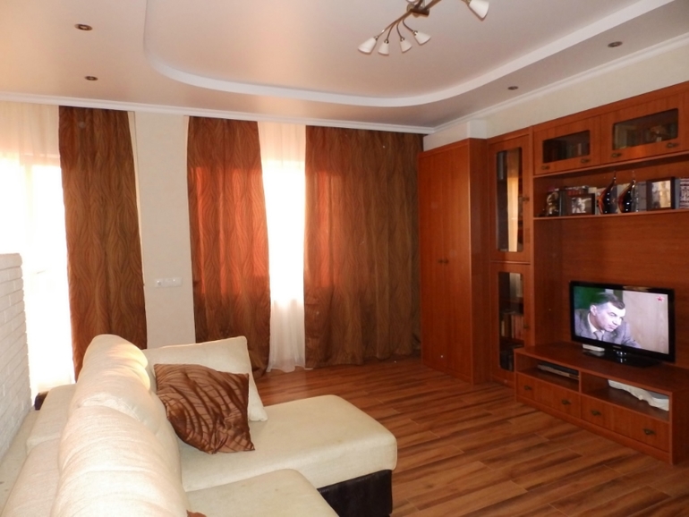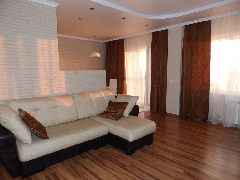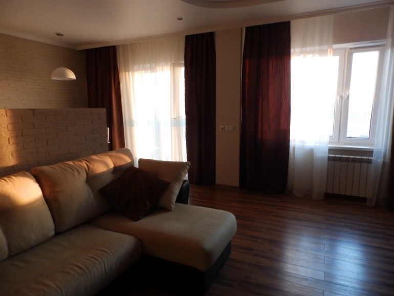 Мне показалось, что цвет в гостиной слишком сливается: пол, мебель и шторы получились такие же. В кухонной зоне на фоне светлой стены и пола гармонируют больше. В гостиной зоне просятся больше светлый отттенок. В спальной хорошее сочитание.
