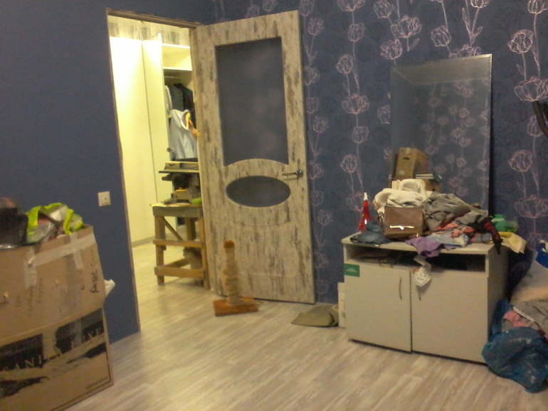 у нас ламинат светлый. Haro цвет дуб аляска... обои сине фиолетовые по бокам от кровати, а у изголовья и на противоположной стене на таком же фоне, тюльпаны серебристо фиолетовым выдаленый рисунок..фото ниже... набарахло н4 обращайте внимания... мест хранения нехватает...