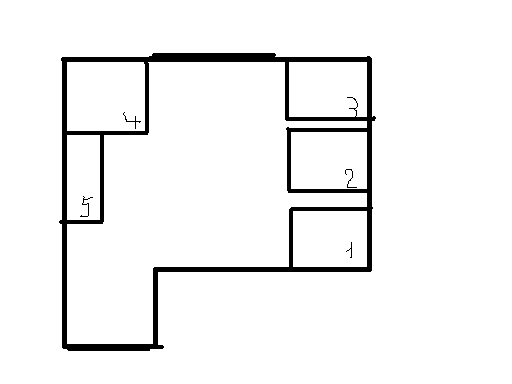 а почему бы вам где №3 не поставить холодильник, №5 вообще не делать, сделать навесные шкафы для посуды, возле окна поставить небольшой столик квадратный , возле угловой мойки, там где стена свободная поставить стиральную встроенную машинку, и там будет рабочая поверхность...не знаю, понятно ли описала...