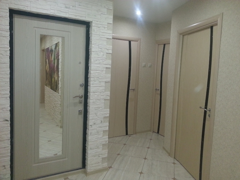 Вопросы и ответыДевочки! Какого цвета поставить мебель в коридор? Хотим беленый .дуб или что то светлое, но не сольется все? Думала может что то цвета полоски на межкомнатных дверях, но наверно темно будет. Вообще не совсем понимаю что хочу, Помогайте ))