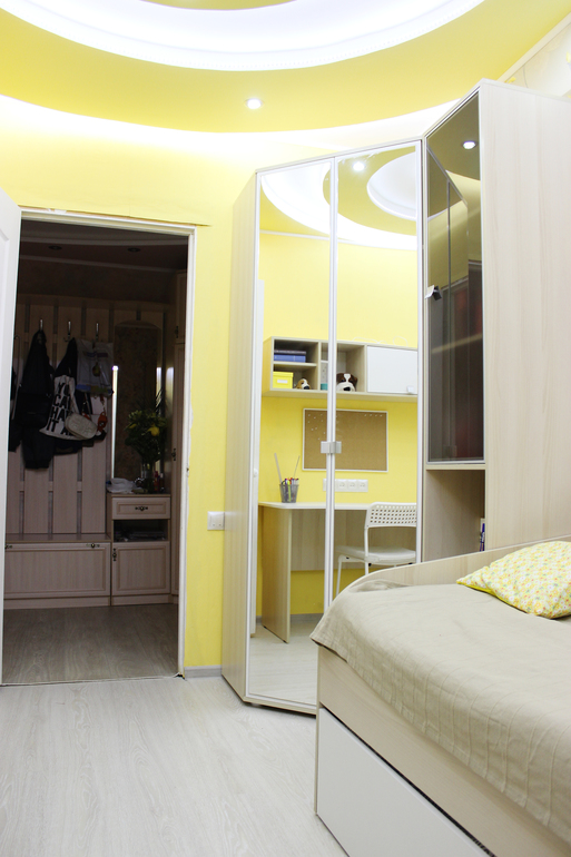 Неоконченное: по ошибке мебельной компании нам забыли выставить в счет выкатные тумбочки под столы, еще должны быть портьеры в тон покрывала и новая дверь, ну и цветочки на полках навесных не придумала еще пока какие) А так...главное светло, тепло и уютно :) ну и жители остались довольны ремонтом ;)