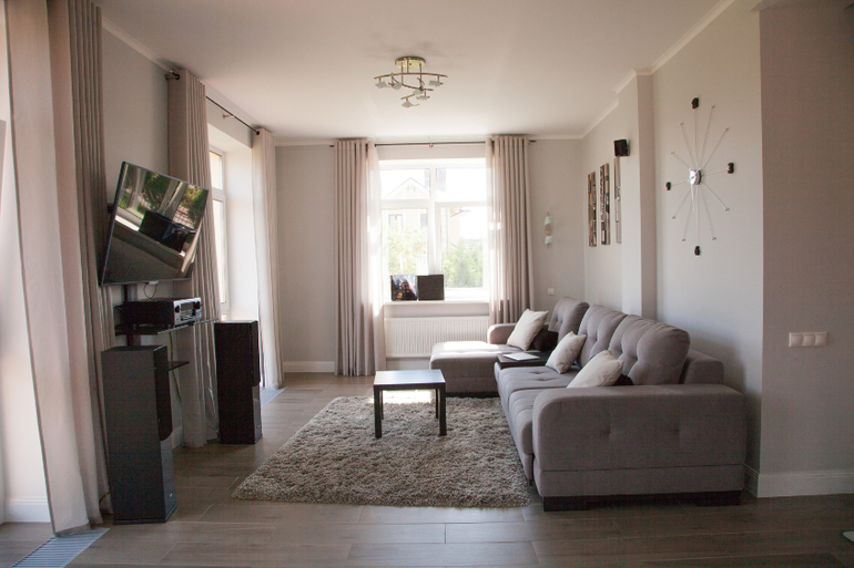 Данное помещение достаточно большое. В нем 4 больших окна. Все шторы стоили около 80000 руб.