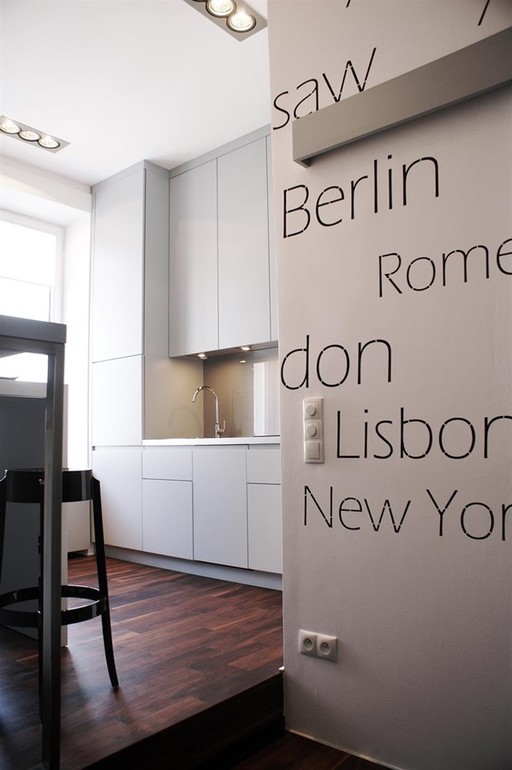 Вот еще маленькая кухня, белый цвет делает ее зрительно большой, а надписи на стене, не делают ее та
