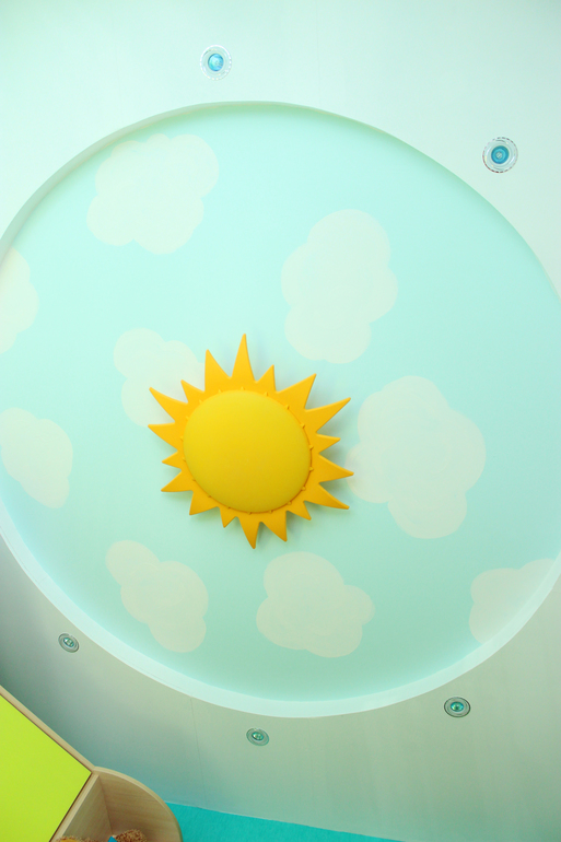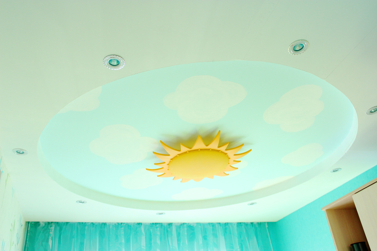 потолок --- решила что должен визуально делать комнату больше, посему он круглый с небосводом и ИКЕЕвской люстрой в виде солнца, люстра мне запала в душу раньше, чем идея потолка, поэтому я своими корявенькими руками решила нарисовать облачков и получилось какое-то там небо :) по-моему очень даже симпатичненькое