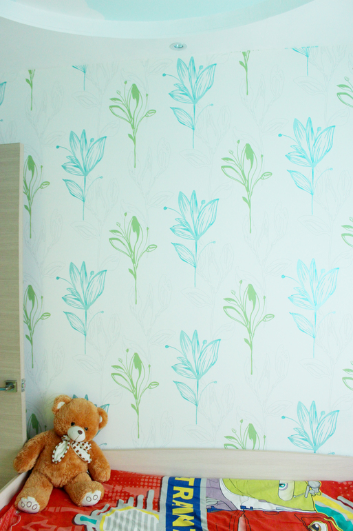 Портьеры вешать не стала, чтобы не уменьшать визуально и без того малюсенькую комнату, на самих окнах висят жалюзи для темного времени суток, а так шторы из органзы с листочками в тон обоев, это обои такие, стены не покрашены, к сожалению фирму обоев я не помню :( Про покрывало на саму кровать - попадались только зеленые, а хочется бежевенькие, и подушки туда из ИКЕИ облачко и солнышко :) которые как раз недавно появились в продаже ... Ну а в целом как-то так, веселенько :)