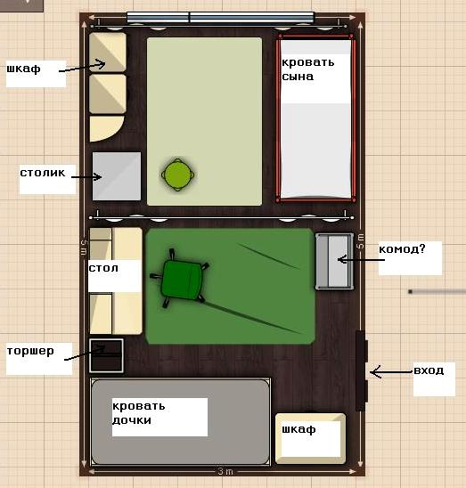 требуется:поместить их в этой комнате с имеющейся мебелью и минимальными ремонтными работами,при этом каждый должен иметь свой личный "домик".разница в возрасте велика,да и пол тоже))