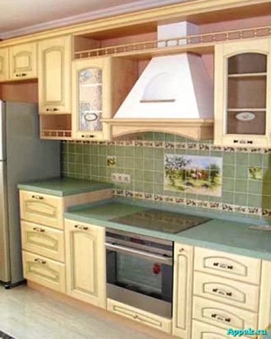 Это ж наша плитка))) У нас по-другому. Верхний и нижний ряд — зеленая, по центру — песочные с элементами декора. Над плитой — панно (какое здесь). Над панно — все зеленое. Только выкладку закончили. Еще не затерли швы. И кухня на нашу похожа. Как сфоткаю — выложу.