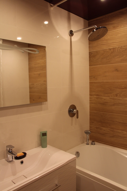 На стене и на полу один и тот же керамогранит под дерево, именно эта идея мне очень понравилась на фото в журнале.