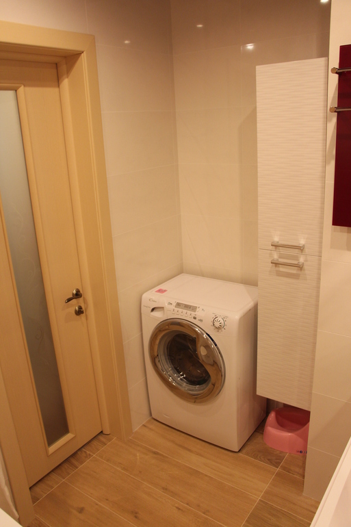 Пока стоит старая стиральная машинка, но планируем поставить колонну из стиральной и сушильной машин.