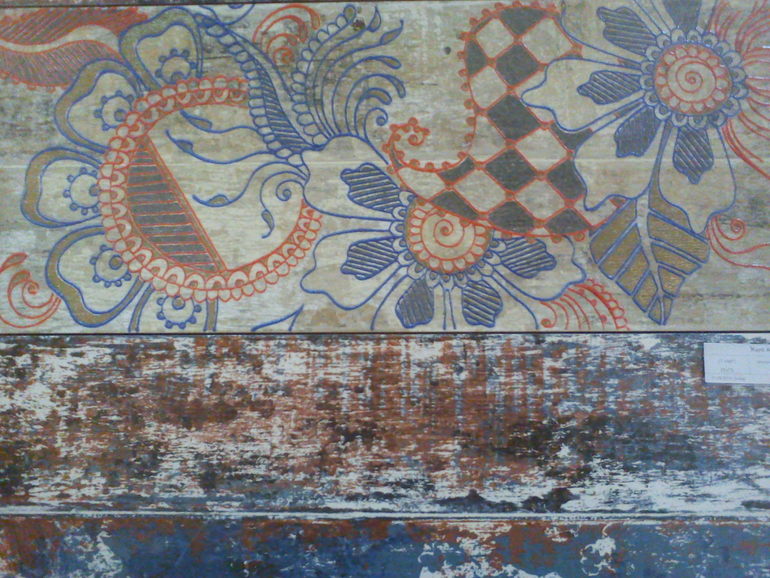 П.С. Пол - плитка под дерево бежевого цвета, как будто слегка "закапанная" синей краской