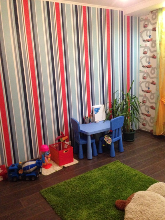 Да нормально все получилось, теперь мебель светленькую однотонную и шторы без рисунка цветного и все хорошо буе , ну и на пол коврик светлый однотонный ))) , а на полосочках будут картинки , рисунки , достижения — очень выйгрышно смотреться )))! Оставьте обойки ))) Сынулька погоняет по дорожкам на стене ,просто больше ничего пестрого не добавляйте. вы у сына спросите — ему как ? нравится ?) , я яркие обой да еще с крупным рисунком всегда по началу в глаза бросаются, потом привыкните ! )) Не обижайте мужа , он старался.