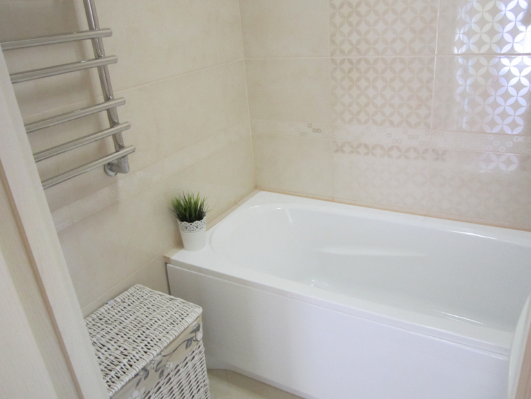 К подбору плитки, как и любая девушка, я подошла очень ответственно. Очень долго выбирала. Хотелось ближе к классике и обязательно светлую. Очень понравилась испанская, но она СИЛЬНО била по карману. Было решено искать альтернативу. Объездив все, что только можно было, остановилась на плитке OPOCZNO. Результат мне пришелся по душе. Ощущаю себя, как в уютном футляре, ничего не давит и не раздражает. Осталось только дело за деталями, чтобы окончательно обуютить пространство.