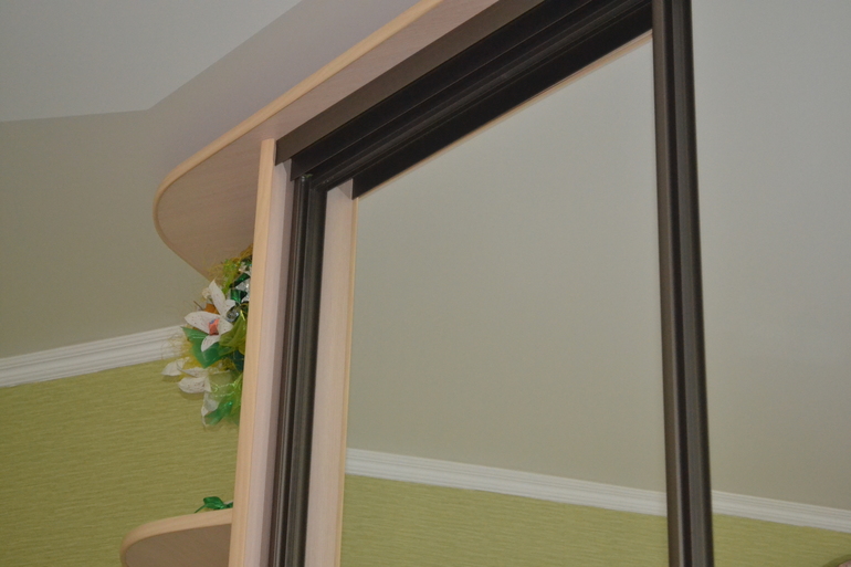 Маленький оскол вверху под метал.планкой на зеркале.....Если отойти на метра 1,5, то его не видно, но если подойти к шкафу и поднять голову вверх, то сразу увидишь...