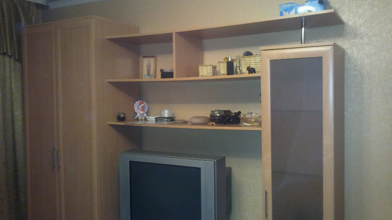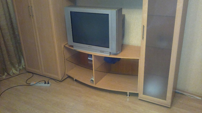 шторы висят цвета горький шоколад и белая тюль и в левом углу шкаф шириной 43 см и высотой 2,50 телевизор не наш но провода также по всей комнате растянуты