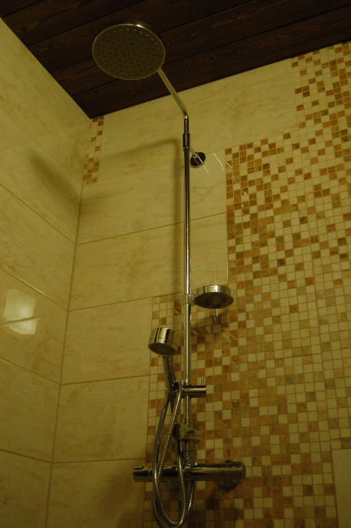 У нас получилась сама парилка с дровяной печкой, площадь 4 м2. и Душевая (плюс туалет) - тоже площадью 4 м2. Душ сделан просто лейкой и в полу трап. Наши родители упорно уговаривали нас отгородить душ каким то поликарбонатом. ну это равносильно, как взять и посреди всего нашего дизайна насрать огромную кучу. ))) они все думают - что вода брызжет во все стороны. Во первых - не брызжет, а во вторых - даже когда моются дети (они кстати в восторге от такого пространства) - пол сделан с уклоном и все быстро утекает куда надо ! )) ну поехали смотреть :