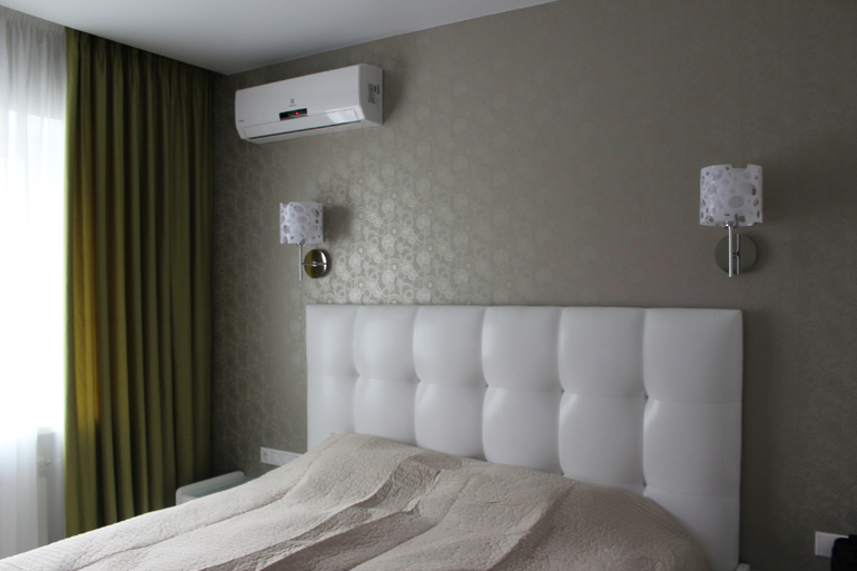 Очень уютная и красивая спальня получилась) Регина, подскажите пожалуйста название обоев. На какой вы высоте прикрепляли светильники прикроватные с такой высокой спинкой.