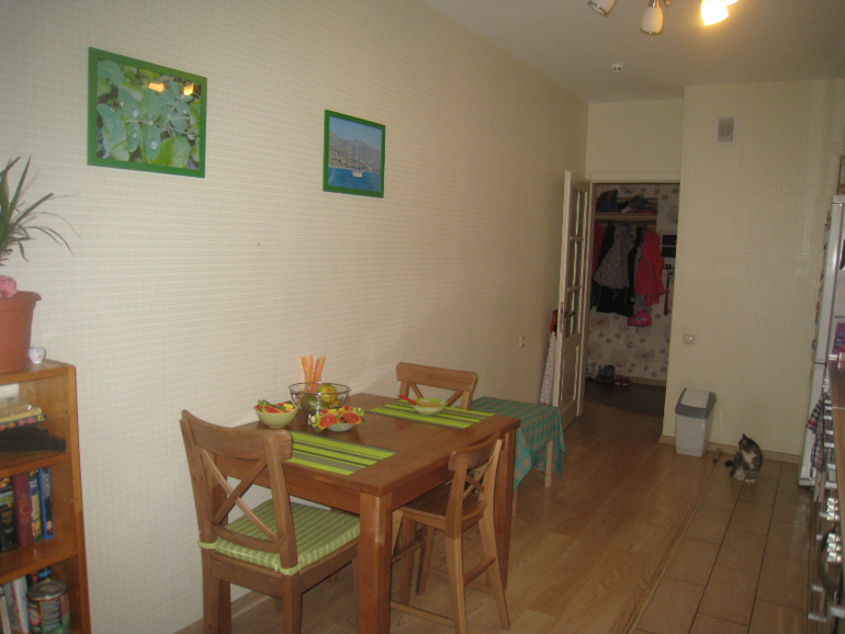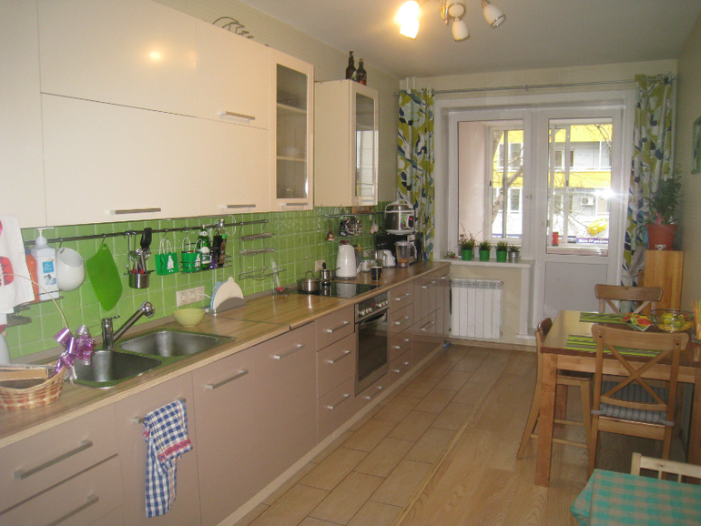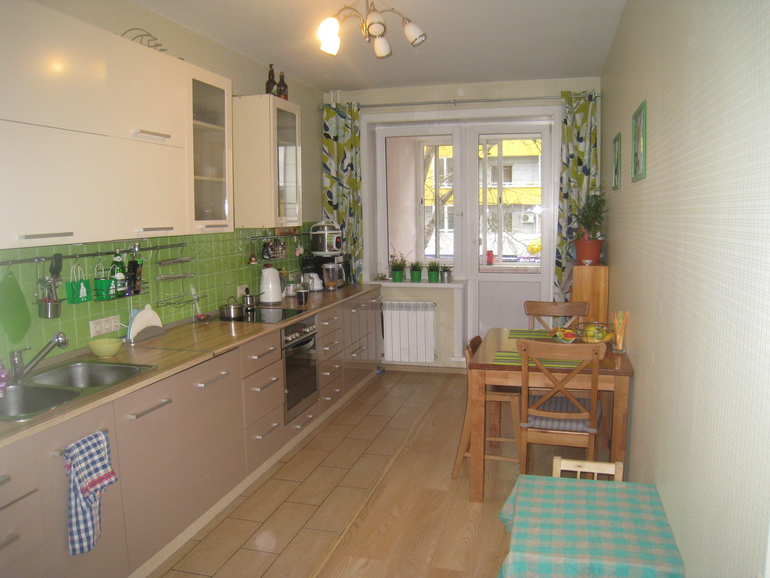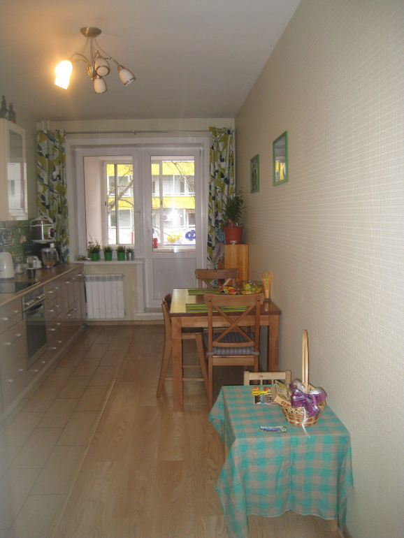 У меня кухня 3,30х5,07. Пошире, получается, а окно, дверь на балкон так же. Но гарнитур я сделала буквой Г и он до стены с окном не доходит, там оставлено место для обеденного стола. Почти посередине комнаты у меня еще и остров имеется. Но проход к балкону достаточно широкий. Правая стена в зоне столовой отделана белым кирпичом, а в зоне кухни - штукатурка, которая продолжается в коридор. Эти зоны хочу разделить кованным стелажом с цветами, там, где штукатурка повешу семейные фото или морские акварели, еще не решила )