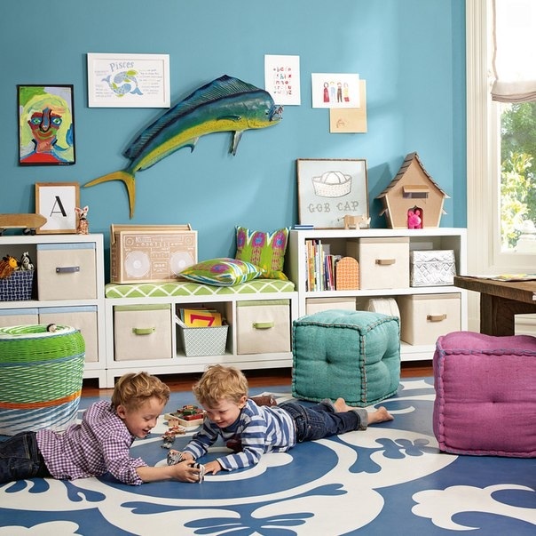 Конечно же, как и у всех деток, у наших море игрушек, которые нужно где-то хранить. Варианты такие, как на картинках, мне очень нравятся. Но сколько стоит ставить таких ящиков, у меня была мысль на всю стену, возможно лесенкой, так как планируем по центру телевизор. Но тогда, где сделать зону для чтения, хочется что-то подобное, с полочками для книг и пуфами.