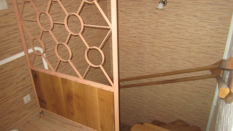 есть такие канатики, очень к натуральному дубу подходят , я покупала их в магазине Касторама, в отделе для цветов-растений. Кажется это называется шпагат, этот канат из чего-то натурального сделан и эффектно смотрится как украшение лестницы и защита от просовывания голов/туловищ мелких детей. А саму железку я бы перекрасила в белый