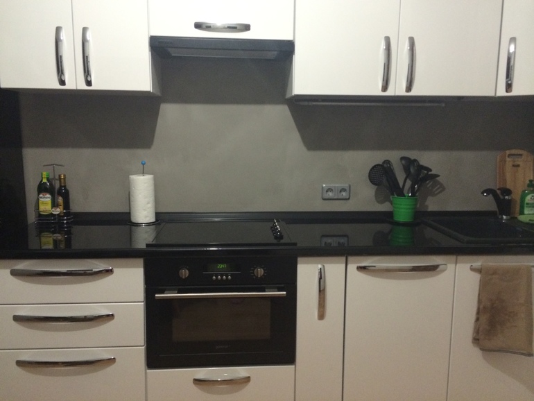 Не, потолок просто покрашен белой водоэмульсионкой, такой и останется. Фартука не будет, микробетон покрытый лаком отлично моется!