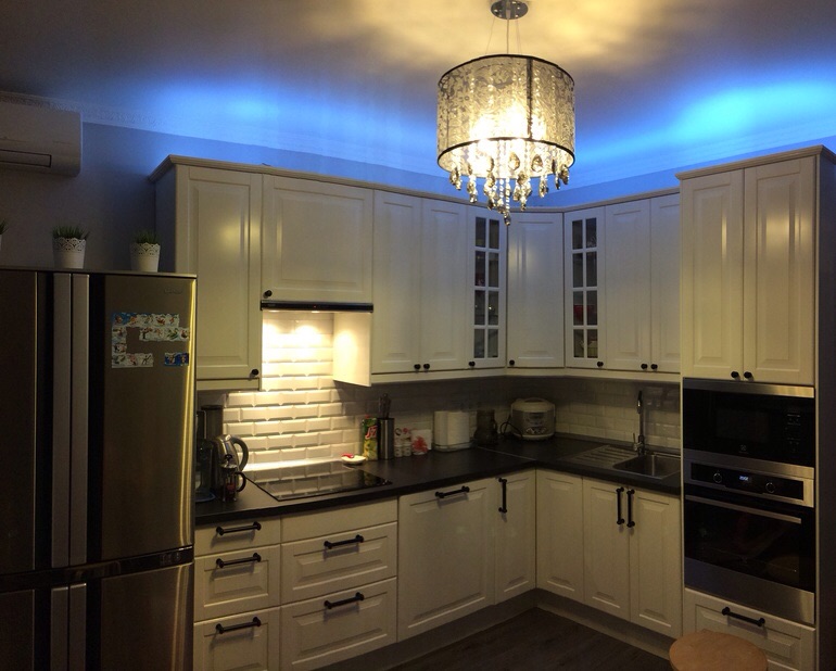 Планируется в моей кухне белая Лидинго, столешница цвета венге, ну , примерно как на картинке (извиняюсь перед хозяйкой картинки, спрела ее без Вашего разрешения) правда, синей подсветки у меня не будет)))