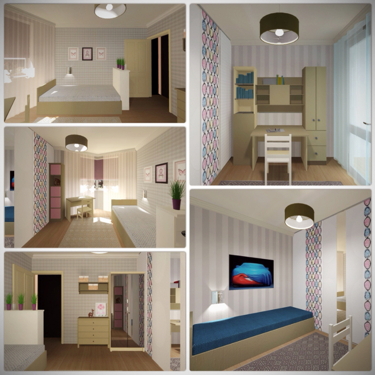 тогда только картинки, причем , думаю, не больше трех, и постель пестрой не сделаешь из-за перегородки.
