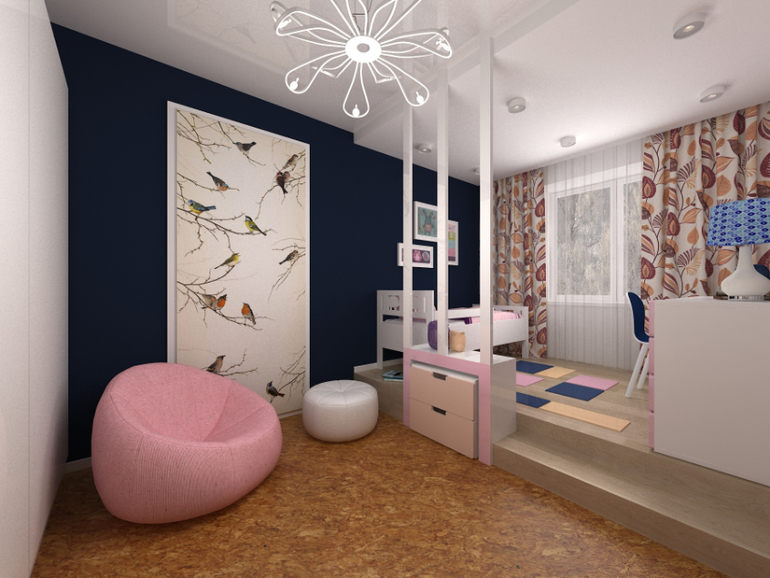 Симпатично, но ступеньки в комнате маленького ребенка это небезопасно. В любом случае дети носятся по квартире, особенно когда их собирается больше одного. А по ступенькам скакать... и пространства меньше становится...