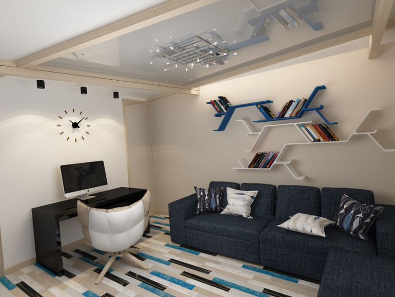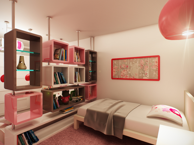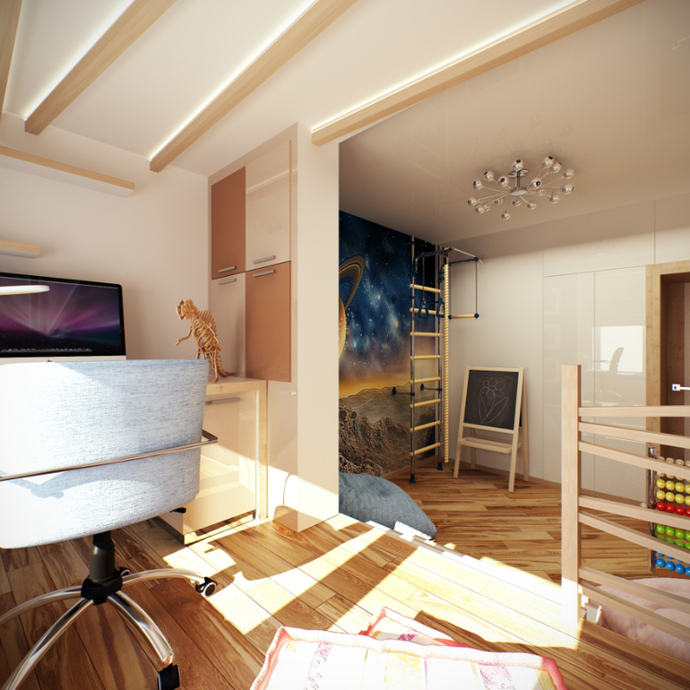 Мне очень понравился первый интерьер — люблю и розовый и зеленый цвет и светлую мебель, но мне кажется, что эта система хранения с пластиковыми тазиками не очень вписывается в интерьер с классической мебелью, может их закрыть такими-же дверцами как во всей мебели, только двойными, или сделать их как маленькие копии большого шкафа. И не очень понравились полки над письменным столом — тоже по-моему ко всей мебели не подходят по стилю, я бы украсила их таким-же карнизом с узором, как на шкафу. В третьем интерьере все очень жизнерадостно и приятно, кроме бросающегося в глаза слишком темного пола. В последнем интерьере углы ступеней надо закрыть силиконовыми противоударными накладками, а под спортивный комплекс обычно маты кладут, чтоб не больно падать было.