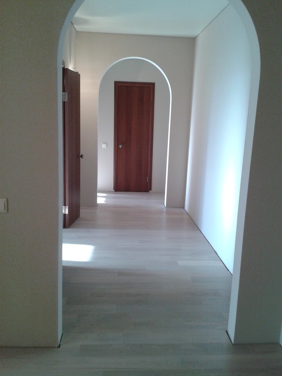 Слева (в кадр не попала) дверь в кухню, далее за первой аркой двери в зал, и за второй аркой спальни и санузлы.