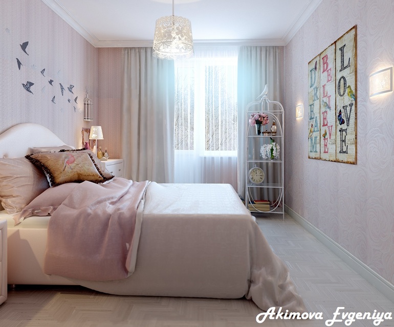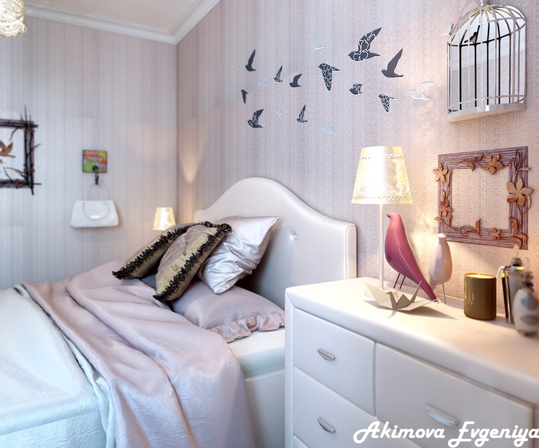 Красиво! А не хотите клетку с др стороны кровати повесить и птичек развернуть к окну. Так бы выглядело,что они в небо летят)