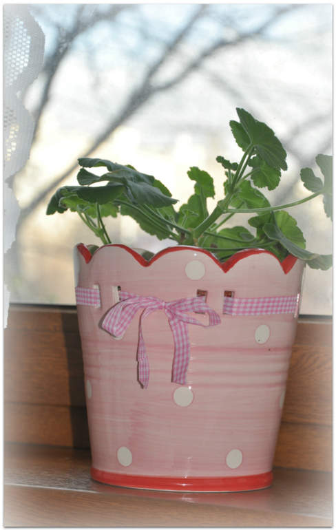 Наша геранька, что-то немного зачахла, но мы ее любим очень, поливаем-рыхлим с дочкой). Кашпо в горошек (обожаю горошек