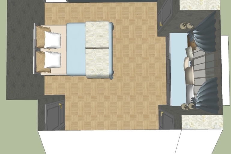 Вот мне так больше нравится, но это мое мнение. Скорее из-за того, что в первом варианте ассиметрия получалась, если с кровати на окно смотреть. Хотелось окно и кровать на одну ось поставить. А в данном варианте кровать центровать по оси симметрии стены с рабочим местом. И расстояния проверить, чтобы везде проходы удобные оставались и двери можно было спокойно открывать.