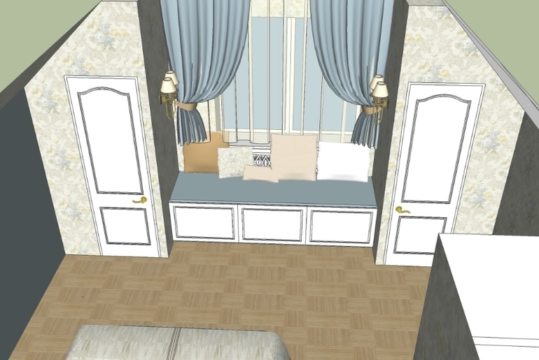 Вот фото комнаты, у нас тоже мансардное помещение, вдоль всей стены скос. Сделали шкаф, можно увидеть, верхние секции скошены, а в нише с зеркалом будет стол. Причем он как туалетный и как рабочий. Перед шкафом короб на потолке с подсветкой для того, чтобы оставшийся скос зашить.