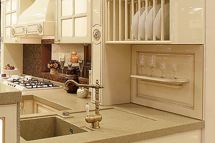Интерьерное решение кухниДевочки, помогите, пожалуйста, выбрать фартук на кухню! Ждать уже нельзя, а я никак не могу найти то, что понравиться и то, что подойдет. Кухня будет белая глянцевая с серебристой патиной (на фото точно такая, но с золотой), столешница черная, на полу керамогранит (уже купили). Столешницу хочу делать из плитки. Пересмотрев кучу вариантов, пришла к выводу, что лучше всего брать белую глянцевую плитку, но какую?