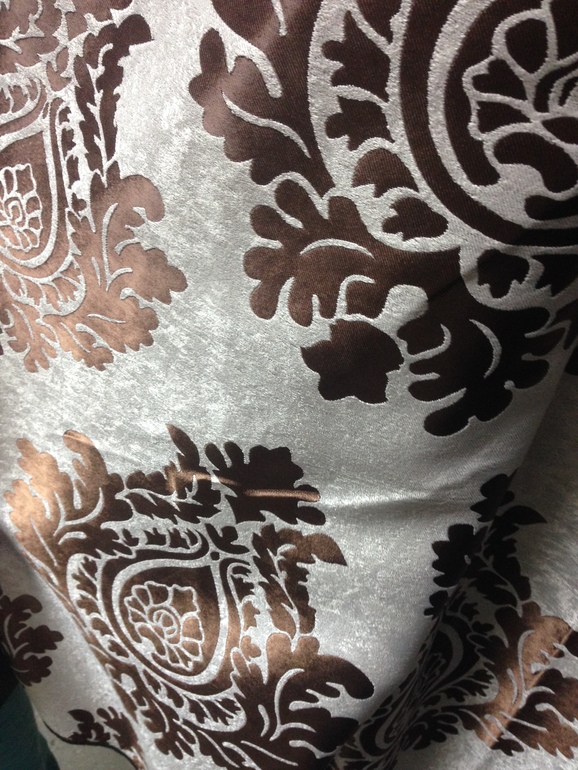 только не с рисунком, получится пестрота во всей комнате. Однотон из гаммы обоев — беж, шоколад, светлый коричневый. Даже полоска может нагрузить рисунком комнату, у Вас и так очень активные обои.