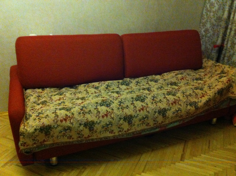 Вид от входной двери. На диване спит сын. Диван отличный, с ортопедическим наполнителем, очень удобный. Но такой громоздкий для маленькой комнаты. Плюс стоит прямо у входа - дополнительное ощущение громоздскости. На втором фото подушки поставлены на изголовье, так мы их ставим, когда сын спит)