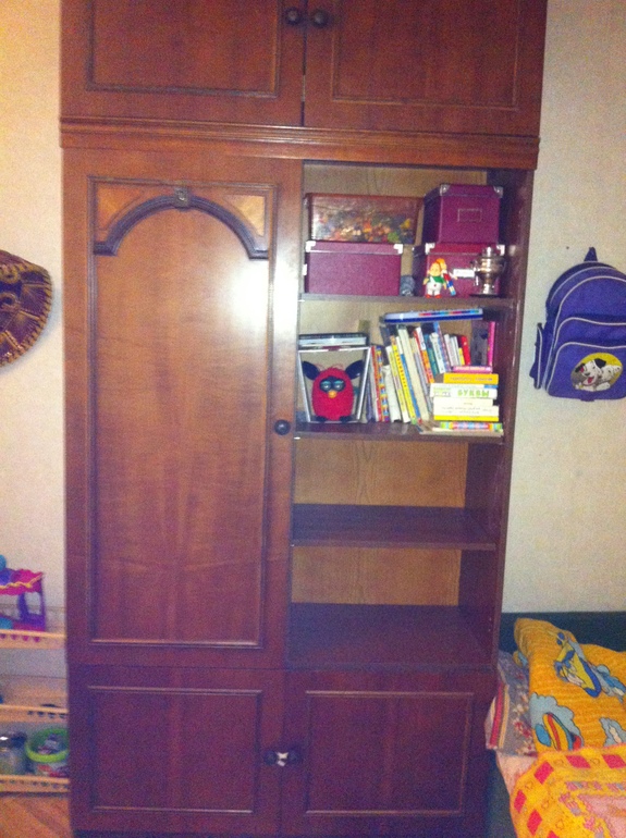 Шкаф у нас очень удобный, одну дверку специально не повесили, чтобы оставить открытые полочки для дочки. Но вот его цвет тоже из другой серии(((