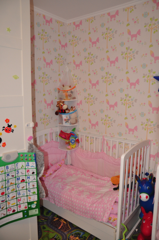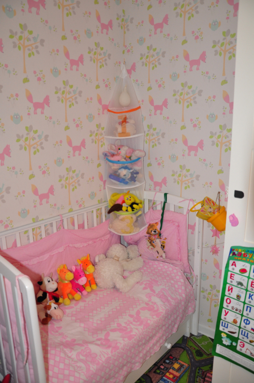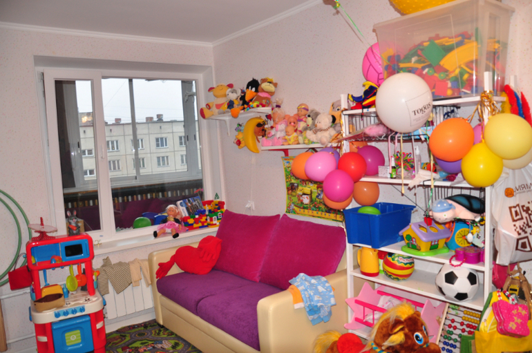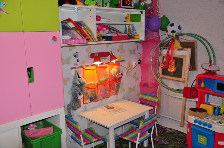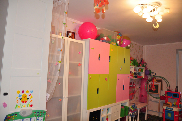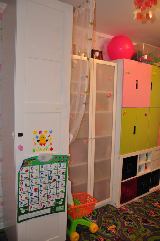 Комната длинная и можно сказать узкая где-то 5,5 на 2,5 метра. Разделена на зоны: спальня\гардероб, игровая(+много хранения :) ) и рабочий стол для творчества + диван.