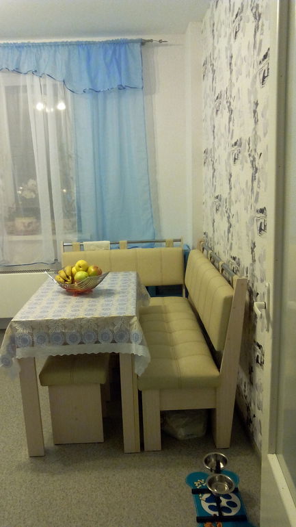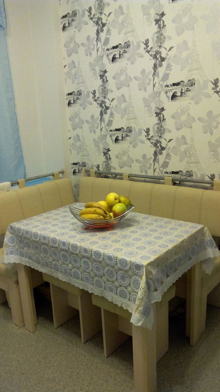 Шторы однозначно менять. Попробуйте шторы к скатерти подобрать или обивки уголка, но не голубые как кухня. На мой взгляд голубого, серого не надо вообще. Что-то потеплее.
