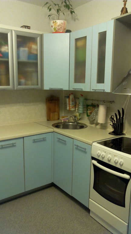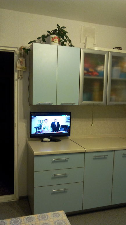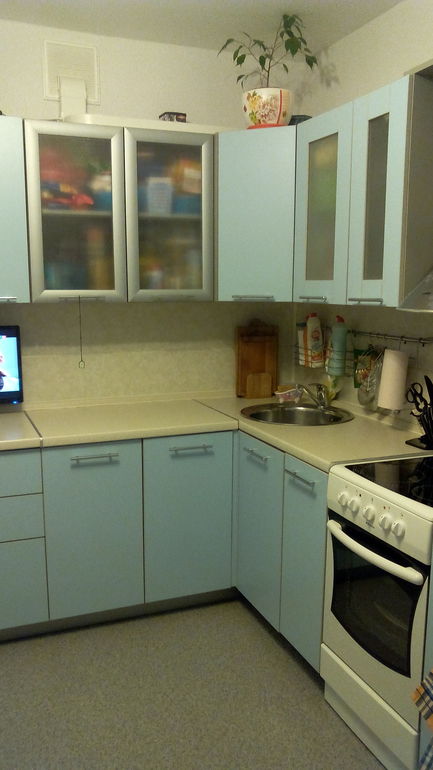 Шикарно!! Нежный приятный цвет:). Шторы и клеенка простят, согласна. Ну и накупила бы красивых баночек, в шкаф со стекляннами дверками. Чтоб совсем красиво:)
