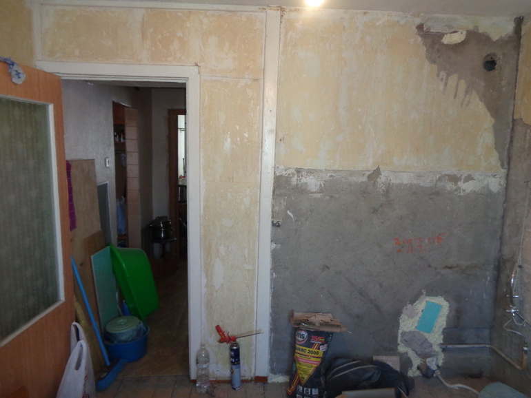 кухонный гарнитур будет располагаться в одну линию у стены слева. идем от окна: холодильник, тумбочка 50 на 60, плита электро. мойка 50 на 80
