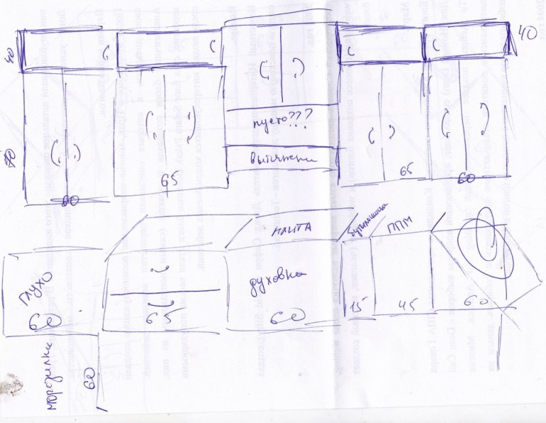 Ой, я что-то разницу во времени не учла ((Нужно вот что : низ наверно мой по схеме, а верх — полный карт-бланш для планирования.Хочется шкафчики до потолка (260 после подвесного). Хочется много мест для хранения, чтобы все туда убрать.По углам: слева ставим микроволновку, кофеварку, тостер, справа мультиварку, хлебопечку или тв — это вдоль окна.