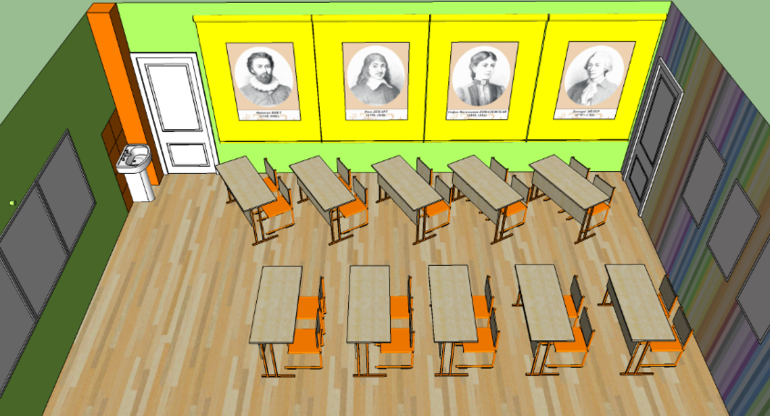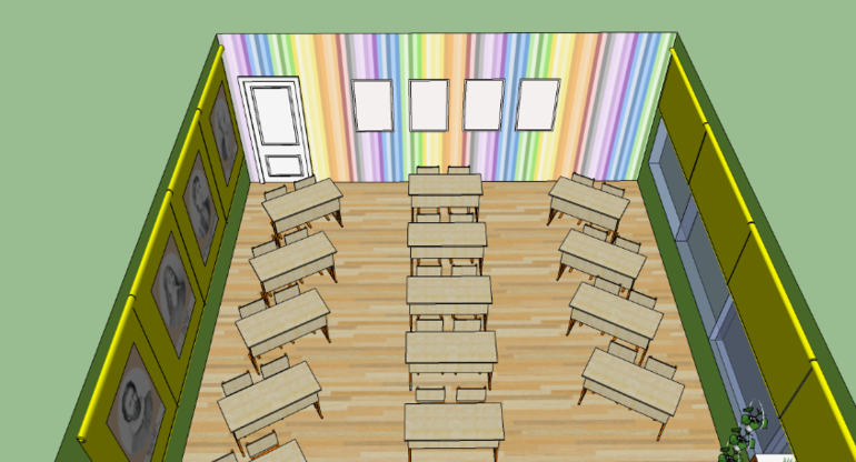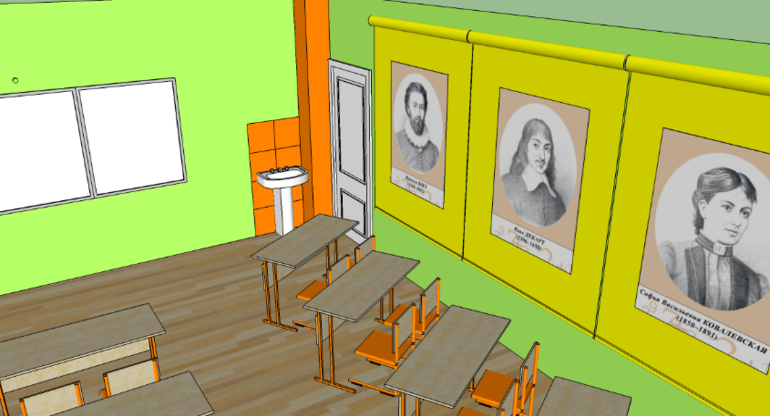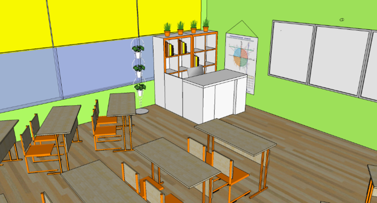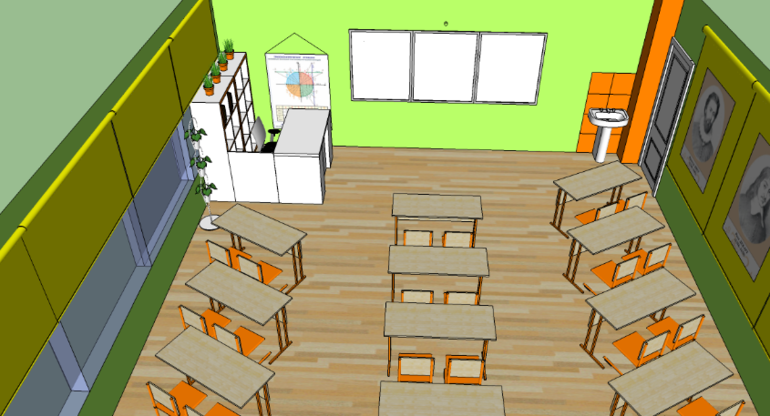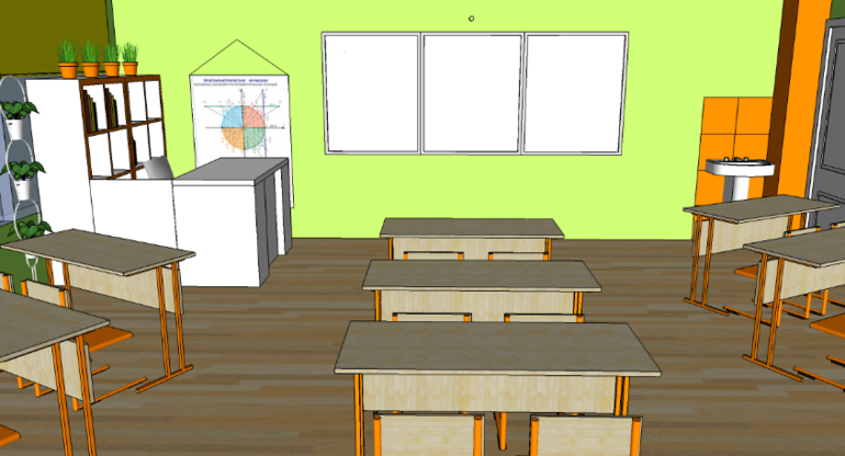 мне все понравилось, кроме стола учителя. Ему неудобно целый день наблюдать под таким углом за детьми, ну а ученикам на первой и второй парте возле окна очень удобно списывать — это будет самый редко просматриваемый угол.