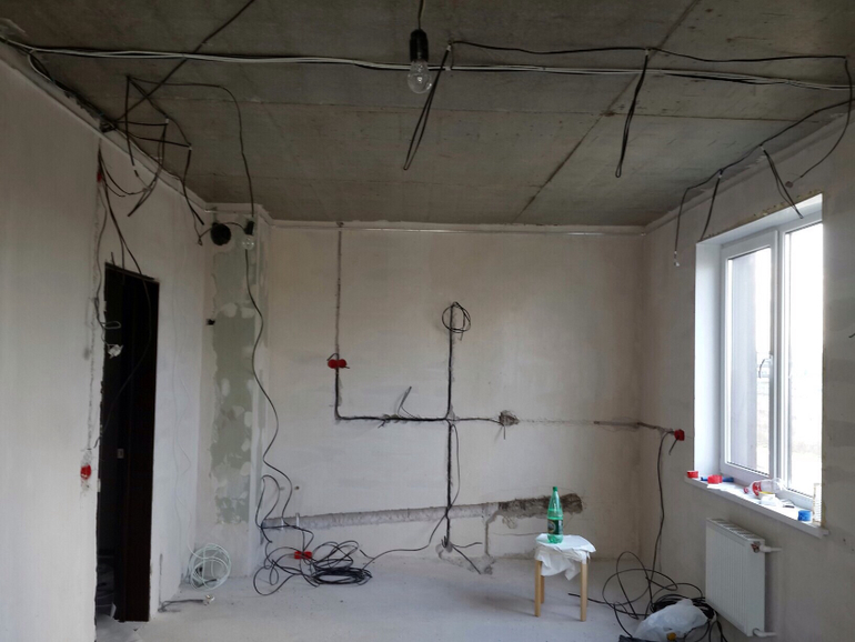 Далее пришли электрики (мы отдельно нанимали специалистов на каждый вид работ, в нашем случае так было дешевле). Как оказалось в нашу квартиру заходило всего 2 кабеля - один на плиту, второй на все остальное. Поэтому электрики предложили все переделывать, а не разводить от существующих кабелей. В итоге на кухню провели 6 линий, в щитке установили соответственно 6 автоматов, по нашим чертежам сделали 11 выводов на потолке, 3 выключателя, 2 вывода под тв и 17 розеток, за все это взяли 25 тыс. На материалы ушло 11200 руб. - провода, 7600 руб. - розетки и выключатели (legrand valena).