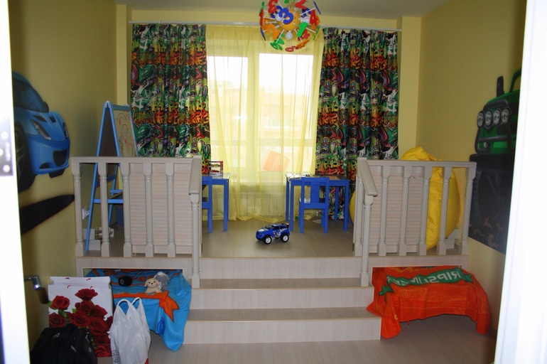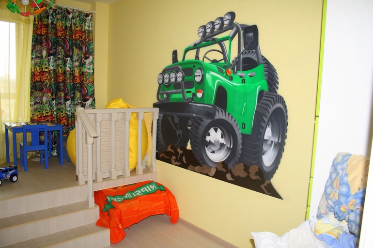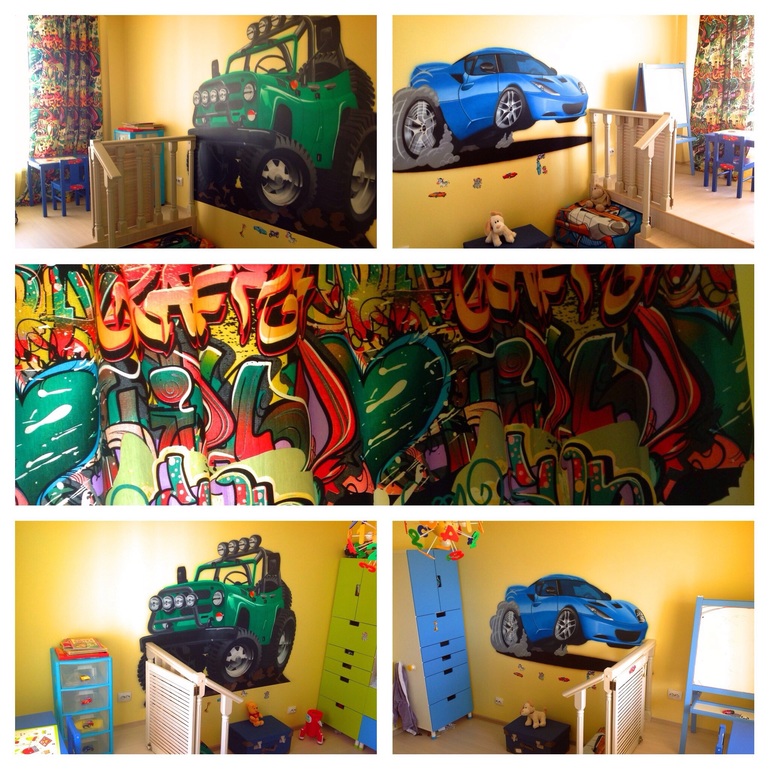 Интерьерное решение детской комнатыКомната небольшая и поэтому мы решили сделать подиум чтобы кровати задвигались и было место для игр...ну и конечно надо было разрисовать стены... Выбрали аэрографию, а машины мальчишки сами выбрали.