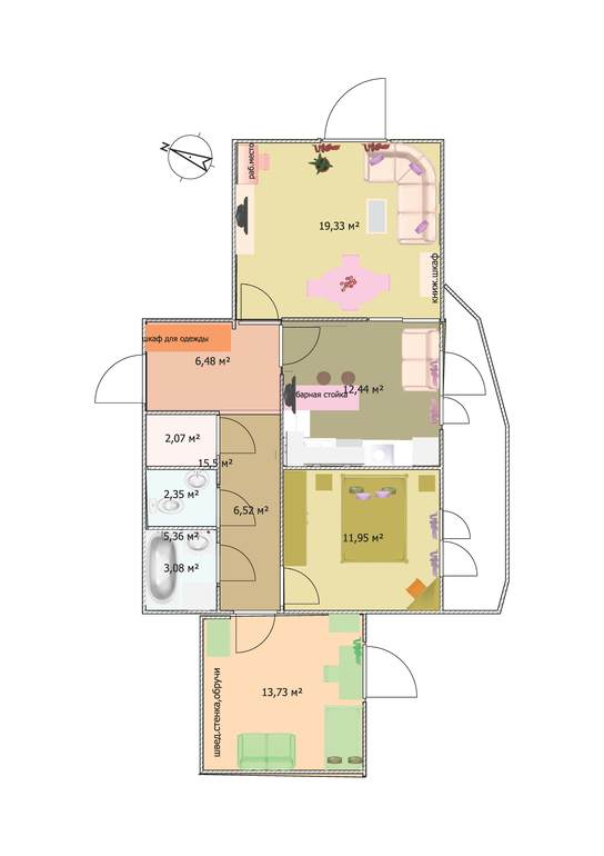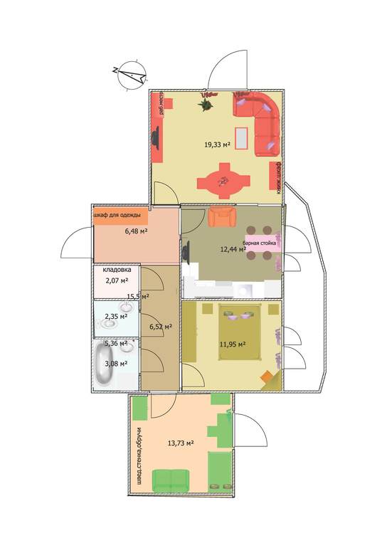 Между гостиной и кухней есть участок не несущей стены (1,5 метра). В целях частичного объединения гостиной и кухни, мы хотели бы его снести и поставить выдвижную дверь, т.к. часто остаются родственники с ночевкой.