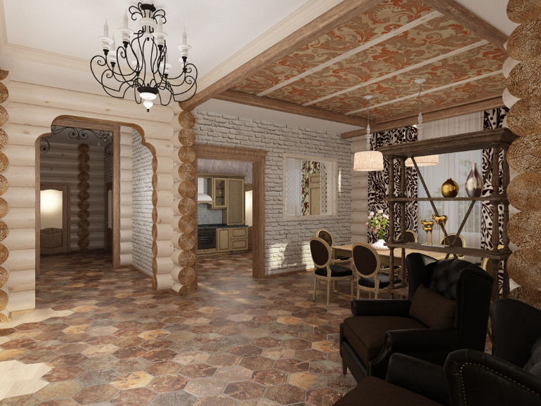 все прекрасно на картинках, а в жизни дом живет своей жизнью:( плитка может разойтись и тд увы:( у меня фартук из мозаики через два года кое где трещины пошли, бревно так себя ведет
